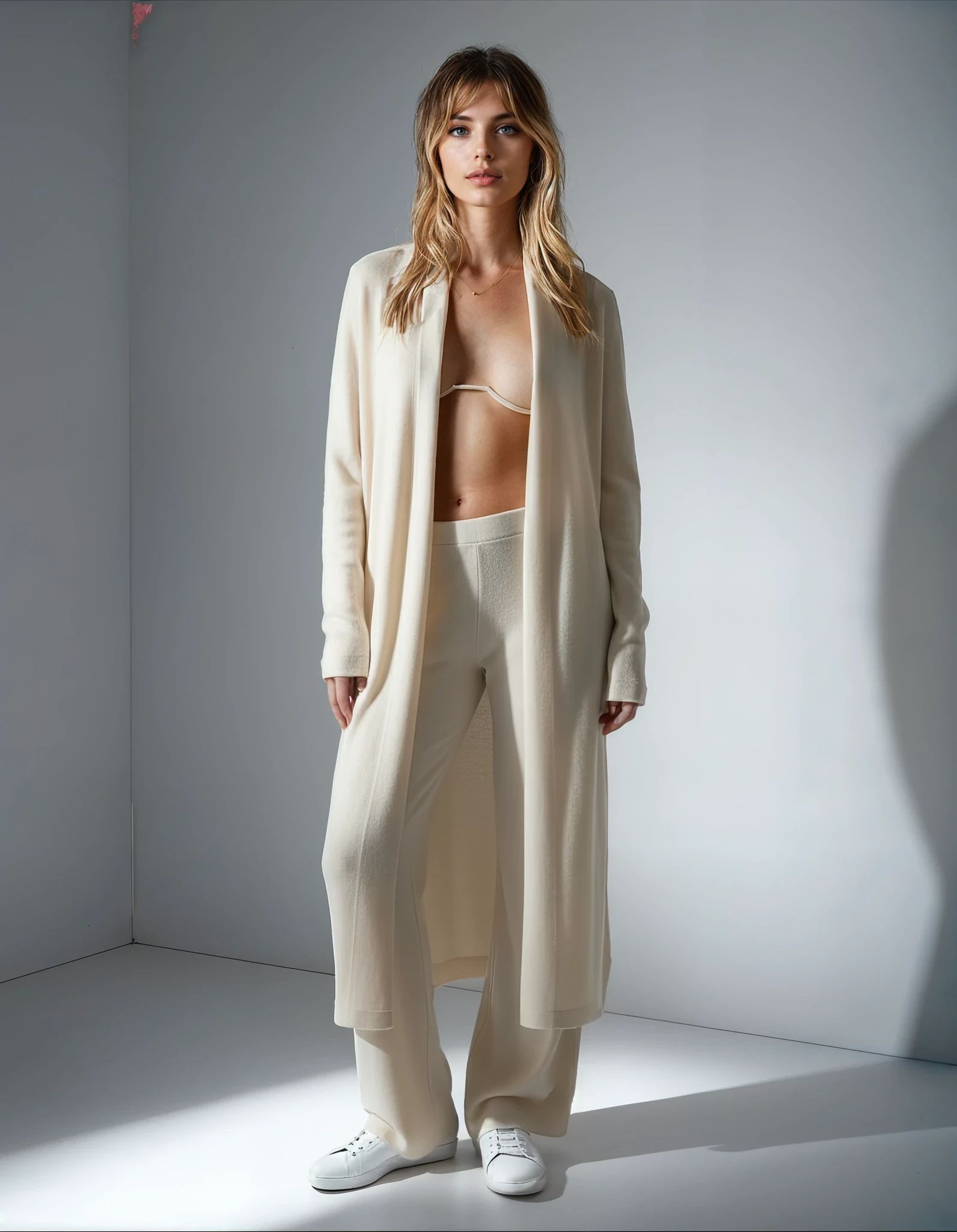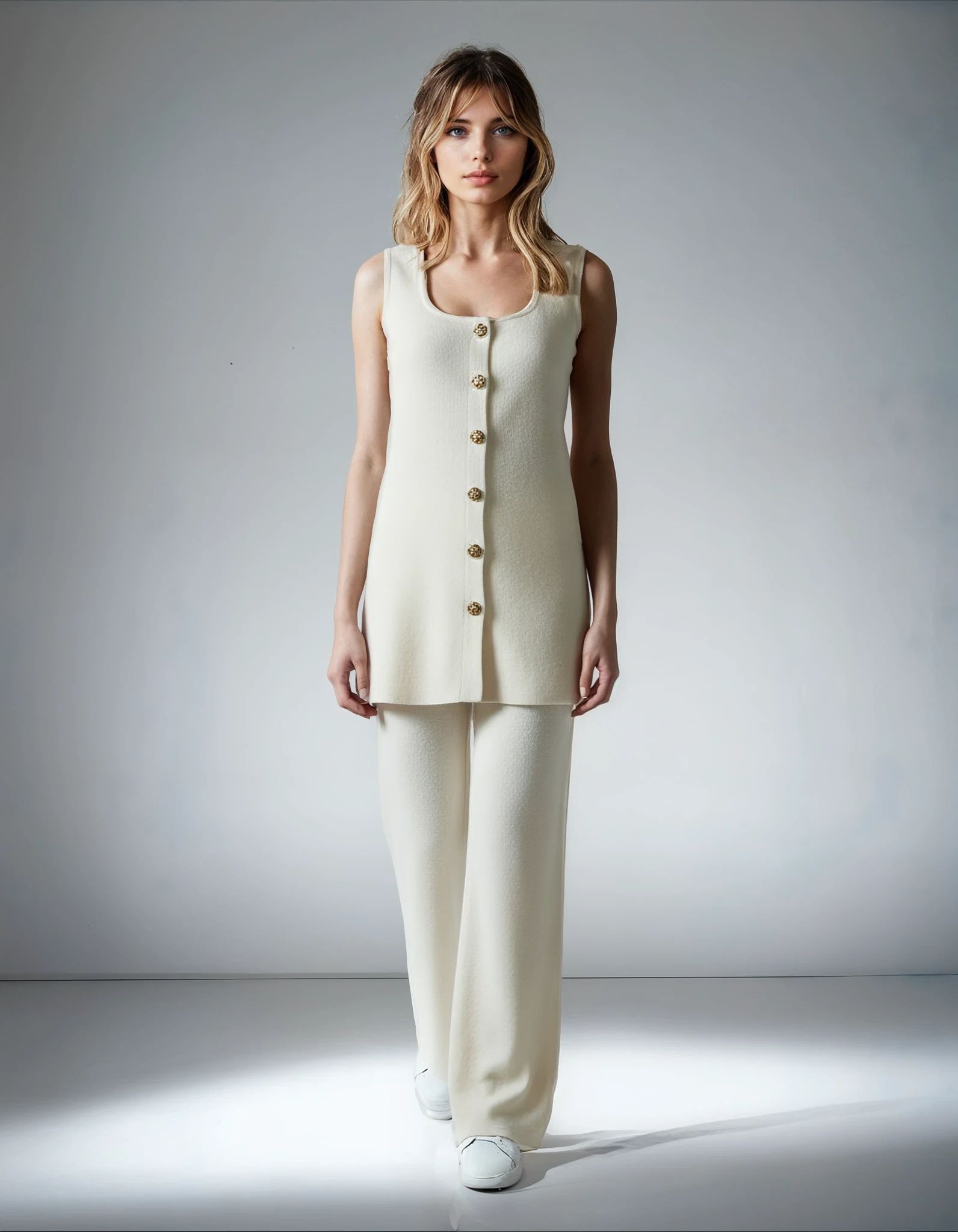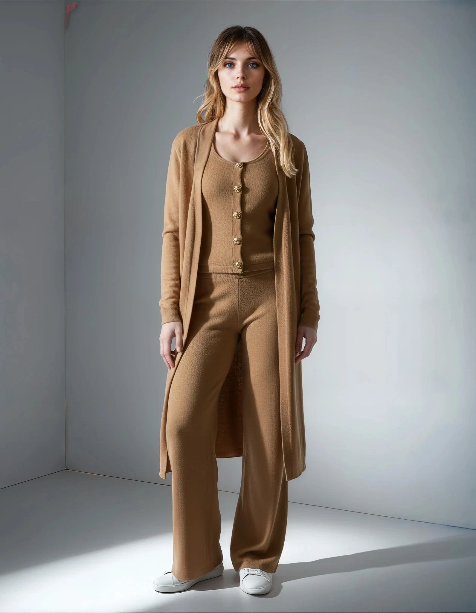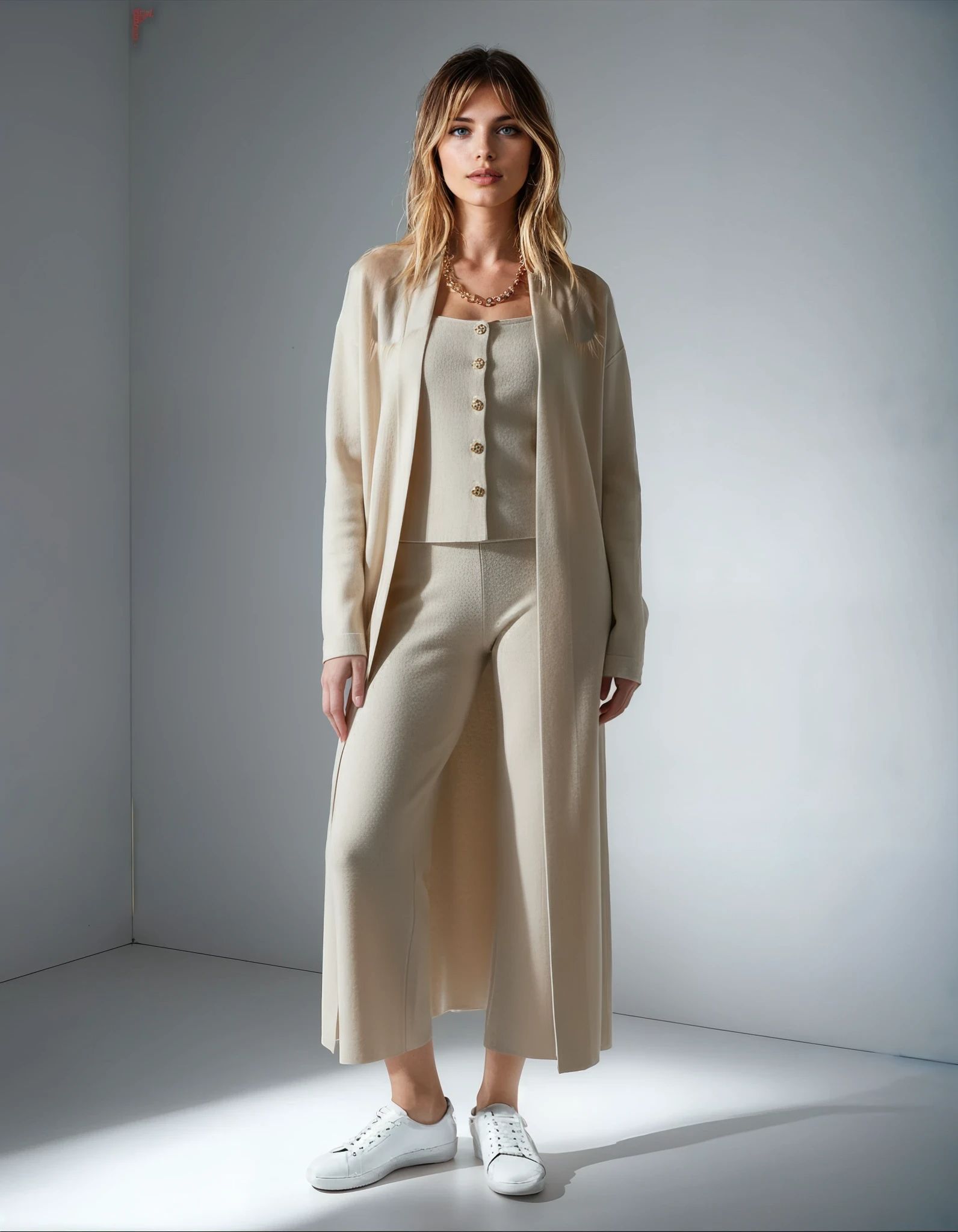 Completo donna in lana viscosa che unisce eleganza e versatilità. Composto da tre pezzi coordinati: pantalone dal taglio raffinato, canotta stile gilè che valorizza la silhouette e cappotto in maglia che garantisce calore senza sacrificare lo stile. La miscela di lana e viscosa assicura morbidezza, traspirabilità e una caduta impeccabile. Perfetto per chi ricerca un outfit sofisticato e pratico, adatto sia a occasioni formali che a look quotidiani curati. Un investimento di qualità nel guardaroba essenziale.